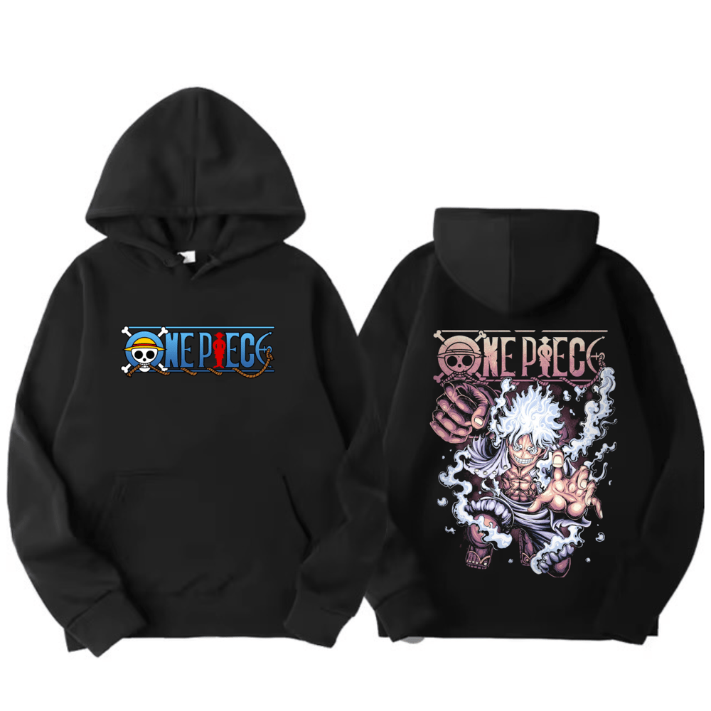 Unleash the power of the One Piece universe with this epic Gear 5 Luffy hoodie. Featuring a bold print of the classic One Piece logo on the front and full-color DTF graphic of Luffy in his Gear 5 transformation on the back, this hoodie is made for true fans of the Pirate King in the making.
